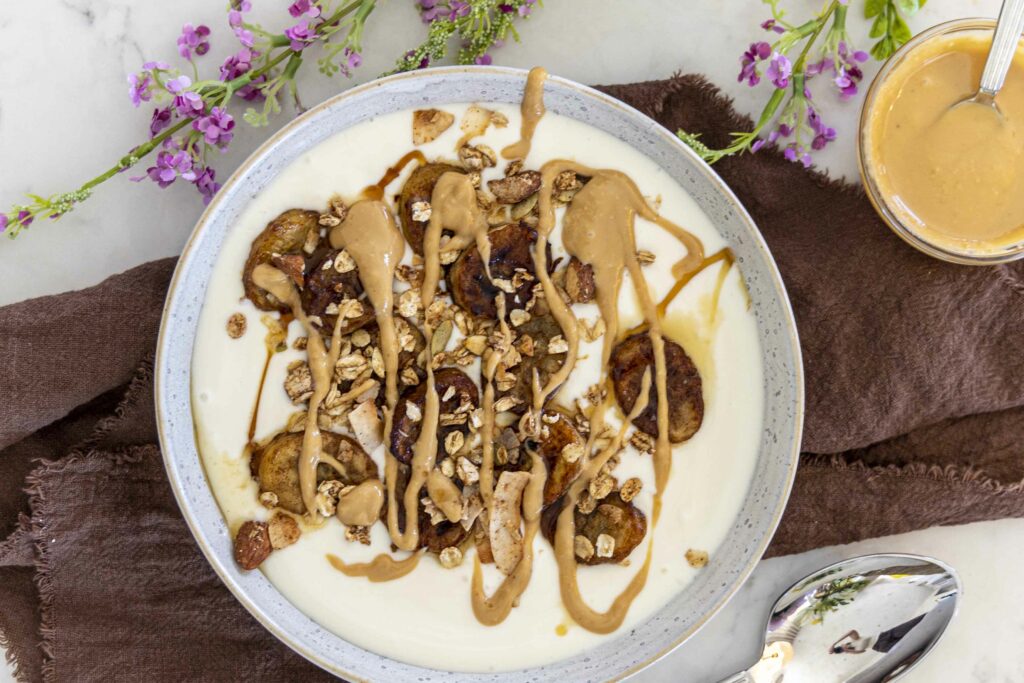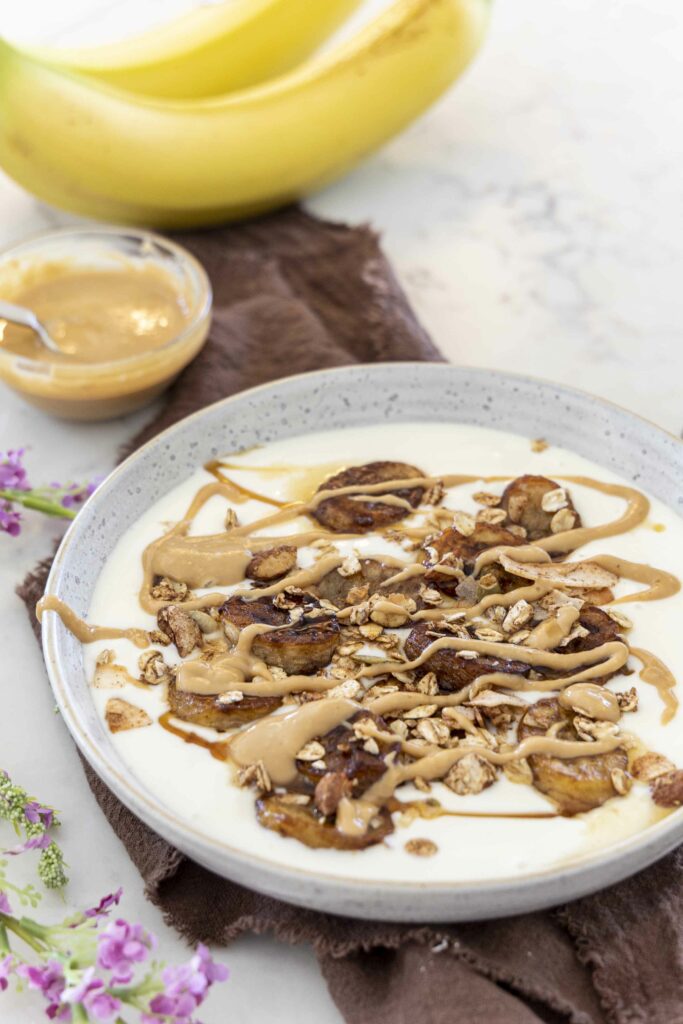 Sætir karamelluseraðir bananar, smá salt og hlý krydd gera ótrúlega mikið fyrir skálina og kemur með þetta eftirréttavibe, þó skálin sé ótrúlega næringarrík og góður morgunmatur eða millimál. Hnetusmjörið bætir svo við dýpt og fyllingu á meðan granóla gefur stökkleika sem bindur allt saman.