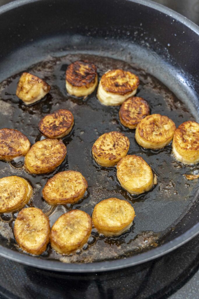 - Skerið bananann í sneiðar og steikið bananasneiðarnar á báðum hliðum þar til stökk gullin húð hefur myndast.