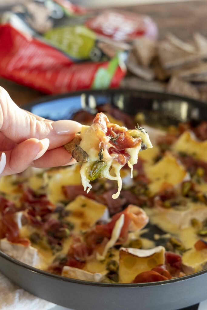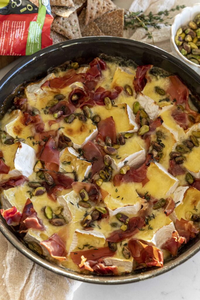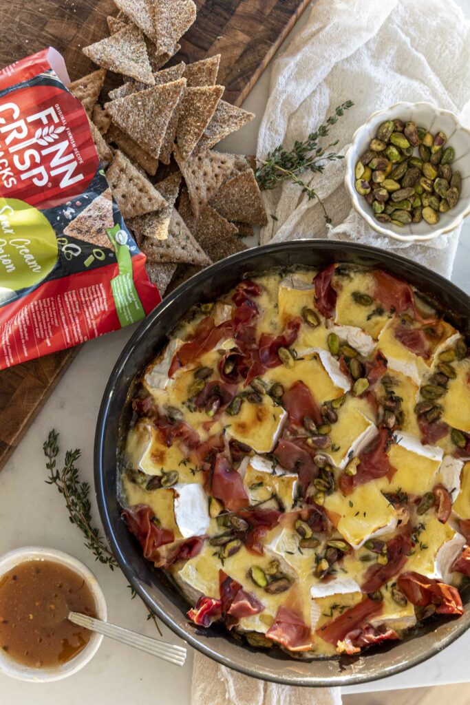 Í staðinn fyrir að setja camembertinn heilann í lítið fat, er hann skorinn niður og settur í stórt eldfastmót. Svo er allskonar gúmmulaði dreift yfir. Hér er ég með serrano skinku, pistasíuhnetur, timjan og heitt hunang. Svo er osturinn bakaður inn í ofni í 20 mín eða þangað til osturinn hefur bráðnað og aðeins byrjaður að gyllast. Osturinn er svo borinn fram með Finn Crisp snakki með sour cream and onion en það passar fullkomlega með þessum osti. Stökkt og bragðmikið, þunnt og inniheldur heilkorn.