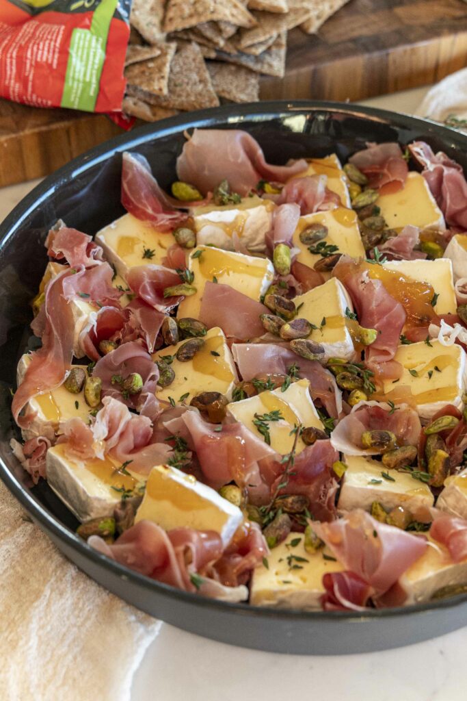 Bakaði osturinn hennar Huldu – Bakaður camembert í fati með hráskinku, pistasíuhnetum, timjan og heitu hunangi.