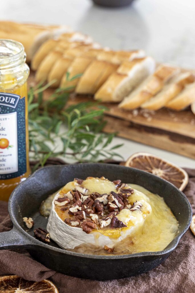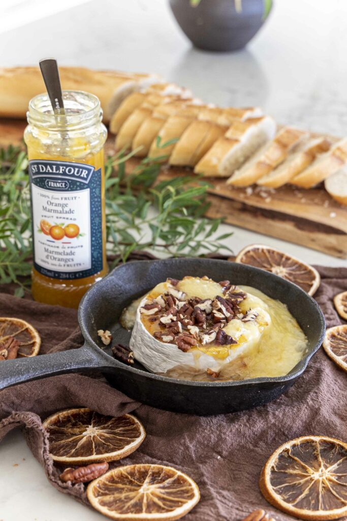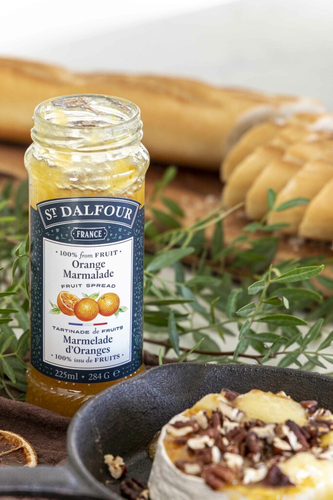 Appelsínu marmelaðið gefur ostinum svolítið jólalegt yfirbragð svona aðeins til að þjófstarta jólagleðinni. Berið fram með nýbökuðu baguette brauði.