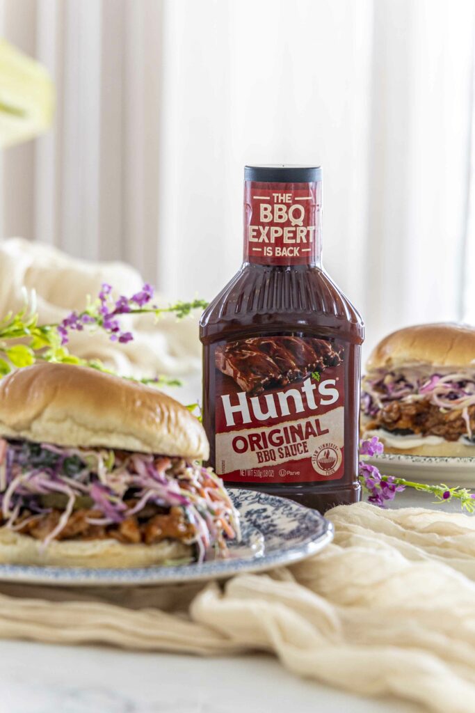 Kjúklingalærin verða einstaklega safarík og bragðmikil þegar þau fá að malla rólega í Hunts original BBQ sósunni. Hrásalatið með lime og mæjónesi gefur léttan og ferskan kontrast sem lyftir öllum réttinum upp og gerir hann ekki of þungan.