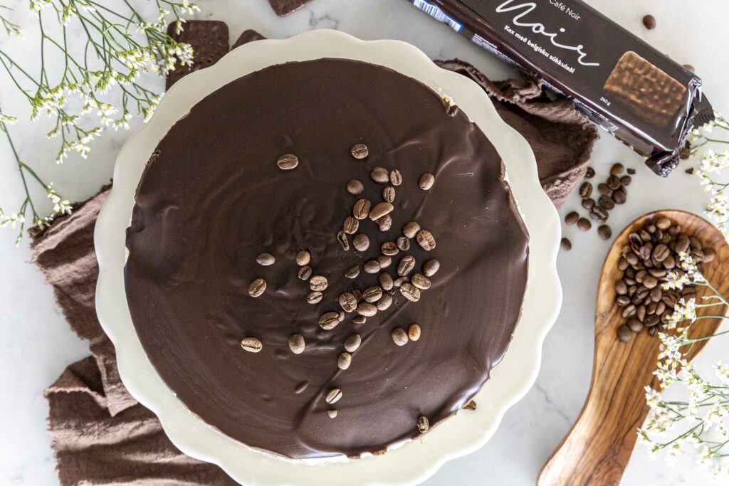 - Takið smelluformshringinn og smjörpappírinn af. Skreytið með nokkrum kaffibaunum fyrir elegant lokahnykk.