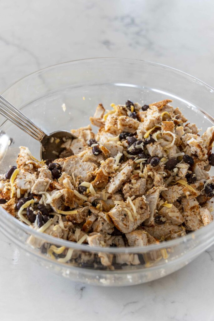 - Skolið svörtu baunirnar og setjið ofan í skálina með kjúklingnum ásamt 100 g af rifnum osti og taco kryddblöndu.