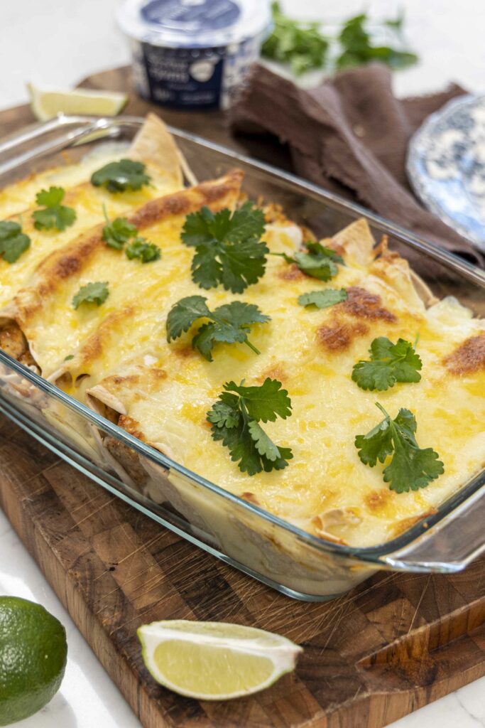 Ef þú elskar enchiladas sem eru extra djúsí, creamy og bragðmiklar, þá er þessi réttur algjörlega málið. Mjúkar vefjur fylltar með kjúklingi, osti og svörtum baunum, baðaðar í silkimjúkri hvítri sósu og toppaðar með bráðnum osti, þetta er svona réttur sem hverfur á augabragði af borðinu.