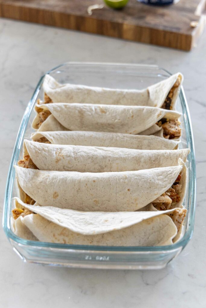 - Skiptið kjúklingablöndunni niður á 6 vefjur, rúllið vefjunum upp og raðið í eldfast mót.