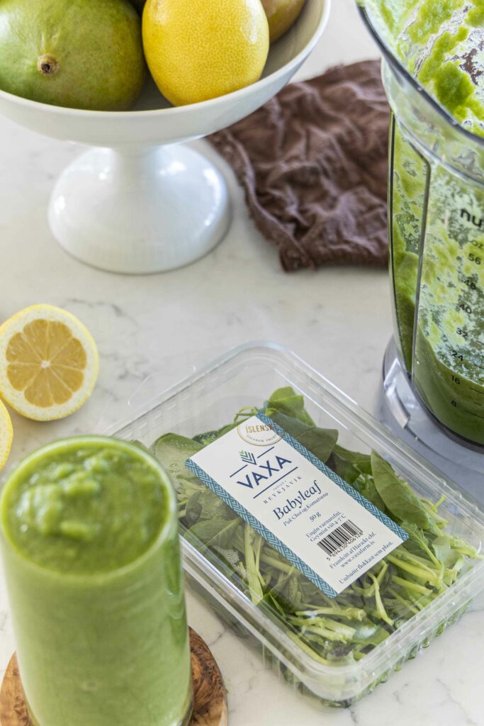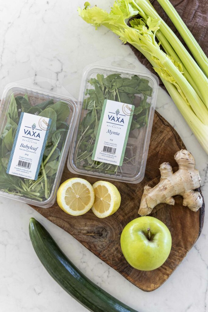 Þessi græni ofurdrykkur er eins og vítamínskot í glasi – ferskur, léttur og fullur af góðum næringarefnum. Sellerí, agúrka, engifer og grænt epli gefa drykknum kraft og hreinsandi ferskleika. Baby leaf frá Vaxa er svipað og spínat nema bragðbetra er stútfullt af næringarefnum. Myntan og safinn úr sítrónunum gefur drykknum gott og ferskt bragð með smá súru kikki sem lyftir drykknum upp á næsta stig.