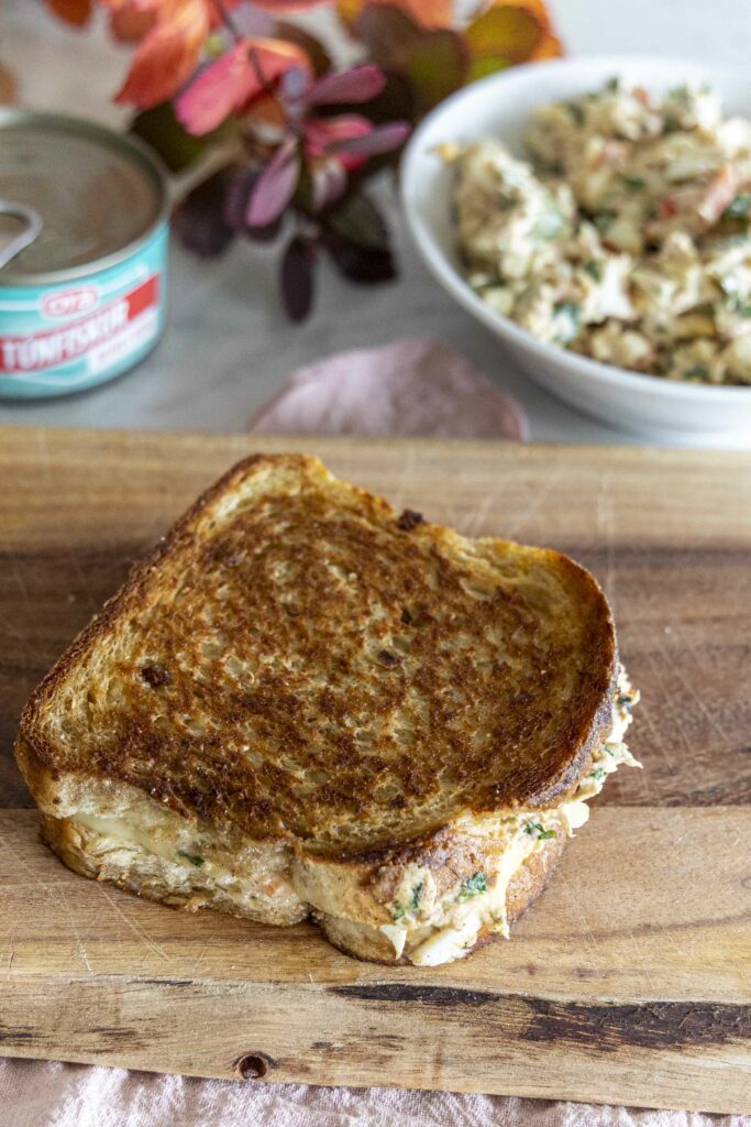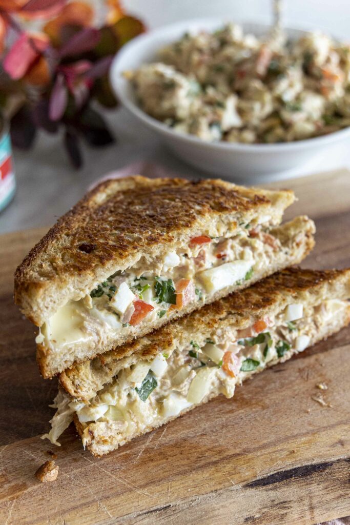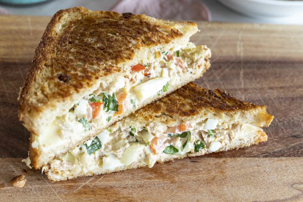 Stundum er einfaldleikinn bestur – sérstaklega þegar hann bragðast svona vel! Þessi grillaða túnfisksamloka með bræddum osti er algjörlega ómótstæðileg, stökk að utan en mjúk og bragðmikil að innan. Túnfiskur, harðsoðin egg, paprika, kóríander og majónes skapa ferskt og djúsí salat sem bráðnar svo saman við ostinn á pönnunni.