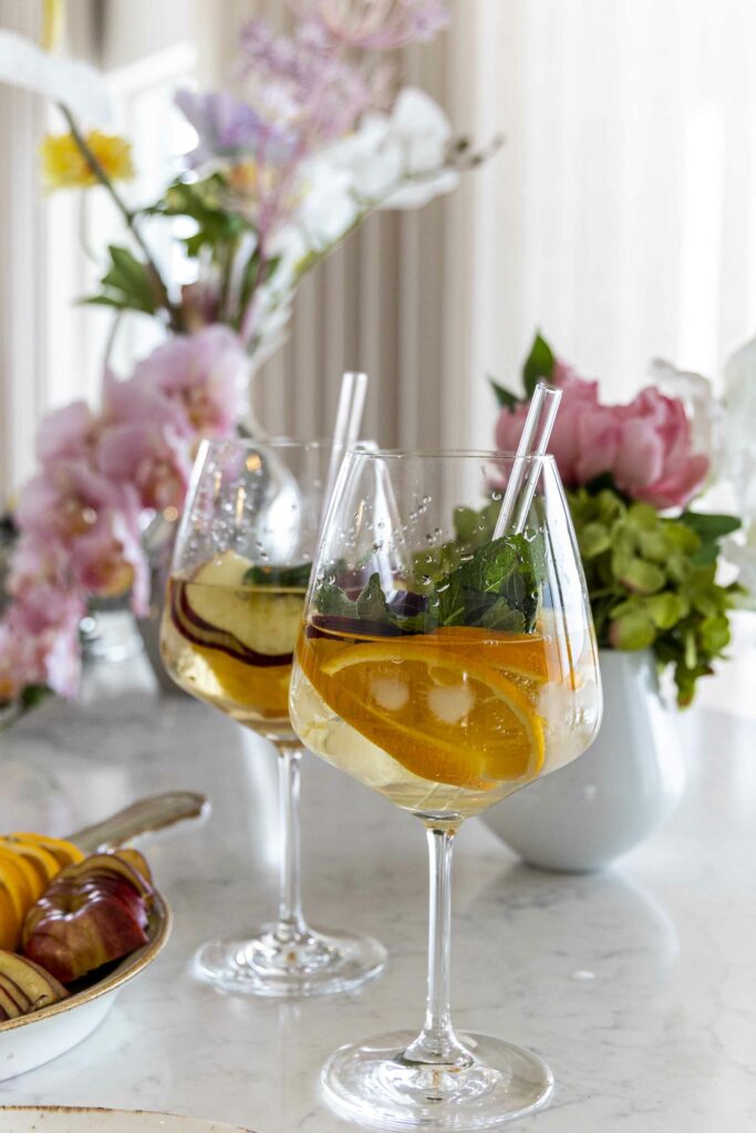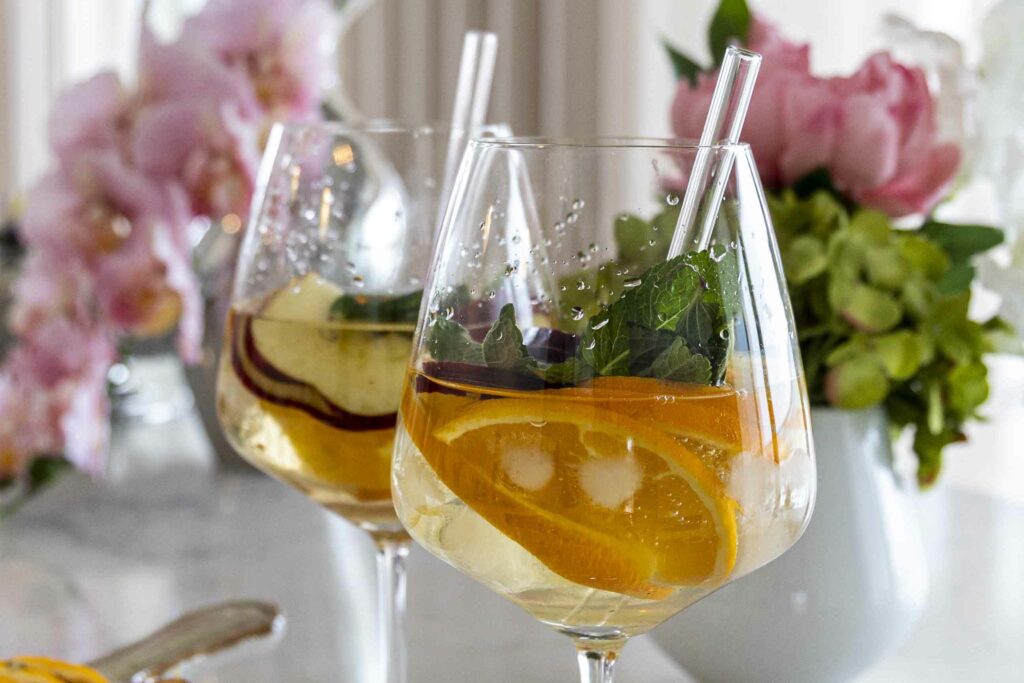 Grunnurinn er gott hvítvín eins og Adobe Chardonnay, sem gefur drykknum fallega fyllingu og ferskleika. Appelsínur, epli og mynta bæta við náttúrulegri sætu og ilm, á meðan Cointreau og heimagert sykursíróp draga fram bragðið og gera drykkinn dásamlega góðan.