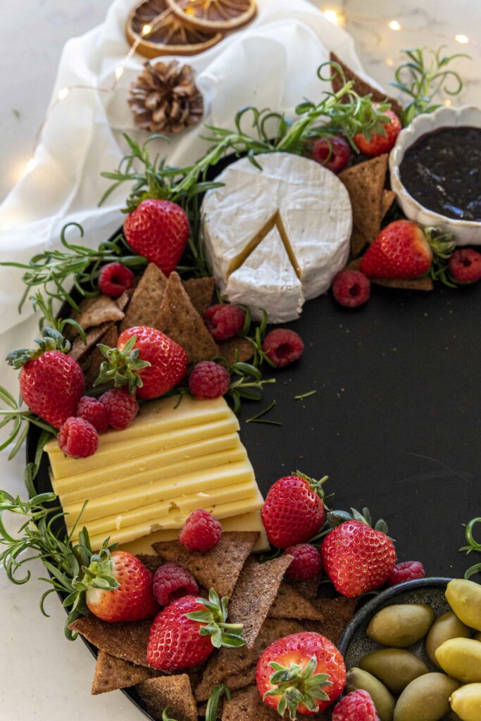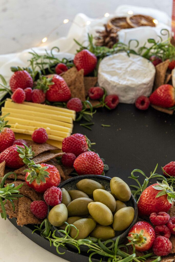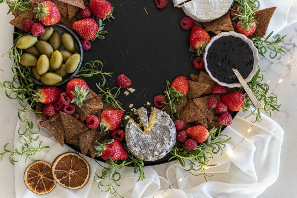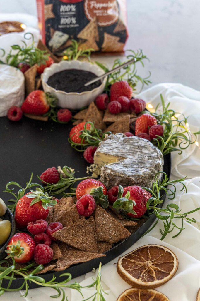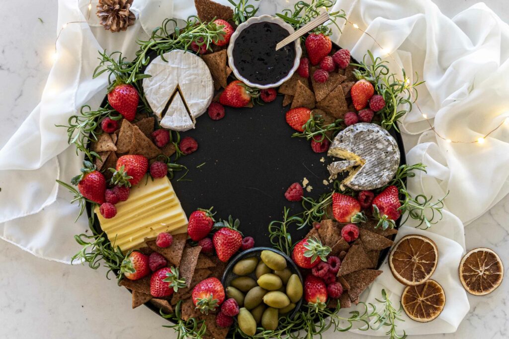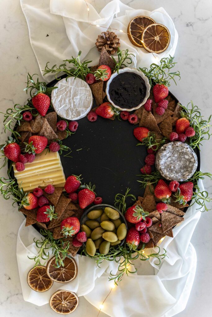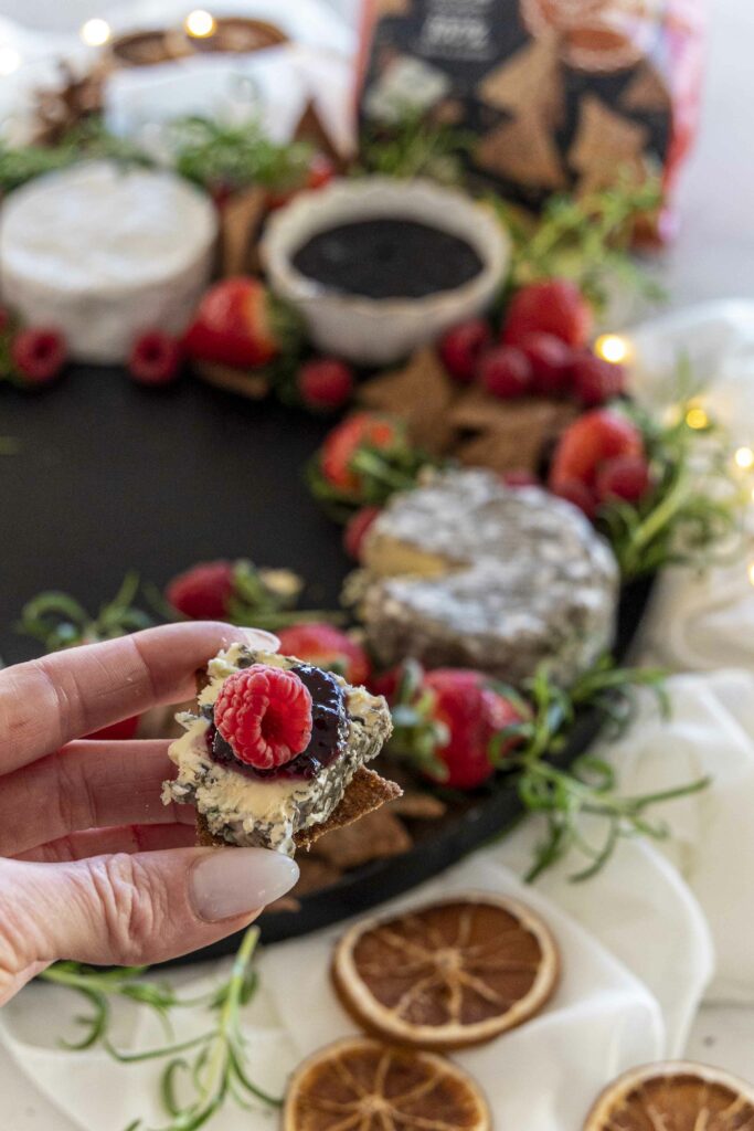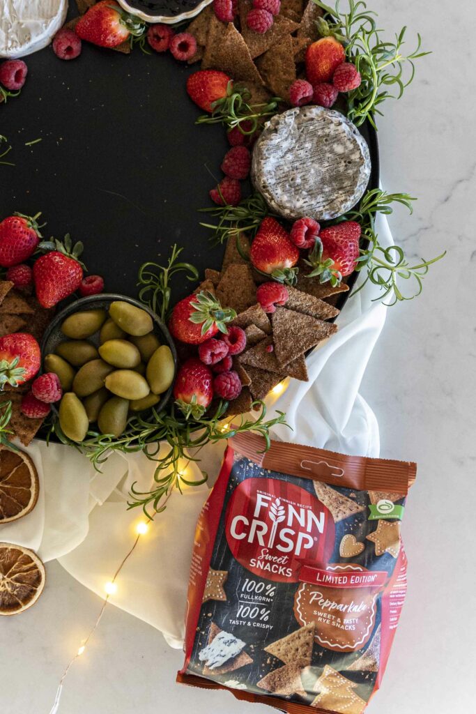 Hér höfum við svo einfaldan og góða ostabakka sem er raðað upp eins og krans. Hann saman stendur af blámyglu, hvítmyglu og hörðum ostum, ólífum, berjum, sultu og alveg svakalega góðu Finn Crisp snakki sem er með piparkökubragði.
