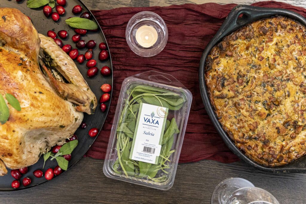 Í þessari uppskrift er kalkúnninn bakaður upp úr salvíusmjöri sem er algjört lostæti. Salvía er svo hátíðleg og ilmsterk kryddjurt og lyftir öllu réttinum upp á næsta stig. Mér finnst líka alveg frábært að Vaxa er farin að rækta ferska salvíu – án allra skaðlegra efna – og hún er svo bragðmikil og góð. Hrein snilld!