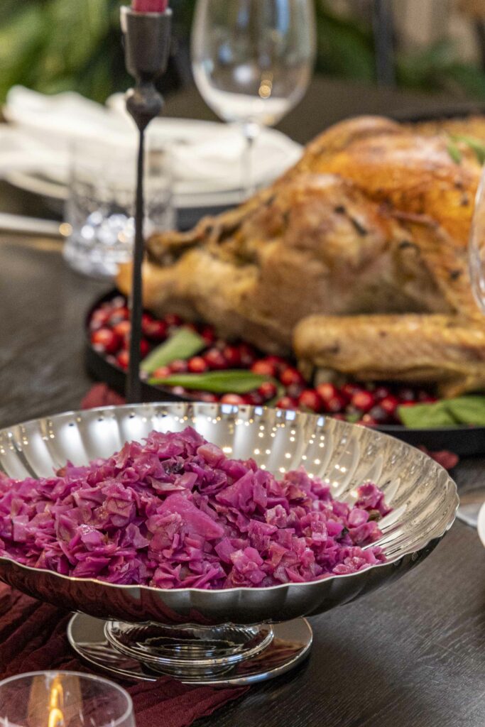 Kalkúnasósan er svo hjartað í öllu. Ég byrja á að steikja innyflin upp úr smjöri og sjóða þau svo vel og lengi til að mynda djúpan, kraftmikinn soðgrunn. Þá tek ég innyflin upp og bæti ferskri salvíu út í soðið til að fá hátíðlega, ilmandi sósu. Það er mjög mikilvægt að gefa sér góðan tíma í sósugerðina því bragðið er í mallinu.