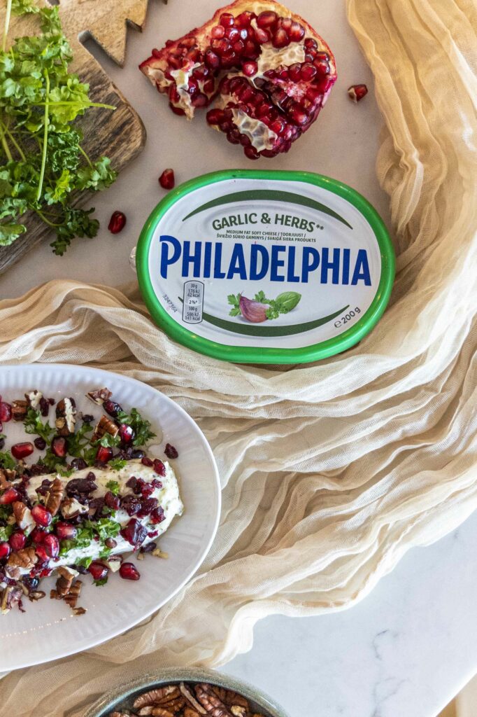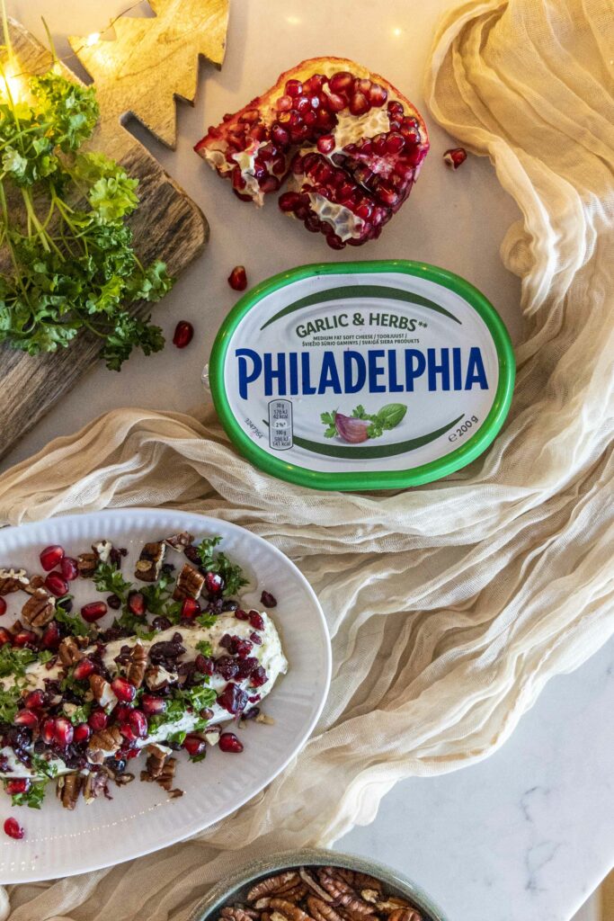 Philadelphia rjómaosturinn með hvítlauknum og kryddjurtunum smellpassar í þennann rétt. Osturinn er léttur og mjúkur. Toppaður með stökkum og bragðmiklum berjum og hnetum. Hunangið gefur réttinum akkúrat rétta sætu svo maður getur hreinlega ekki hætt að borða þennan ost.