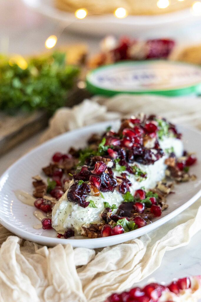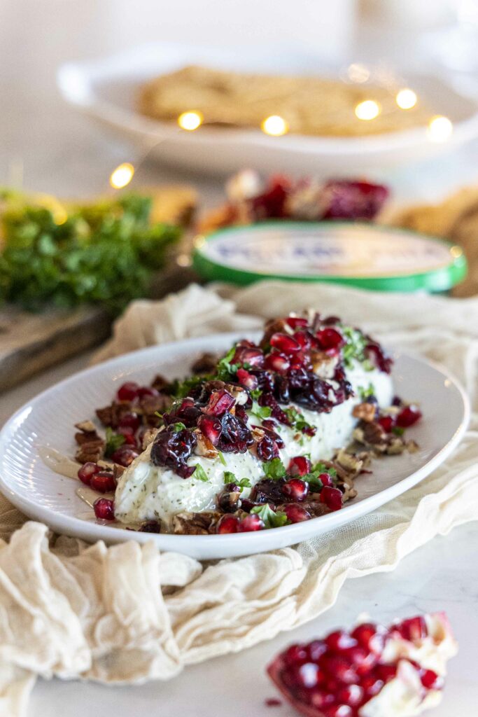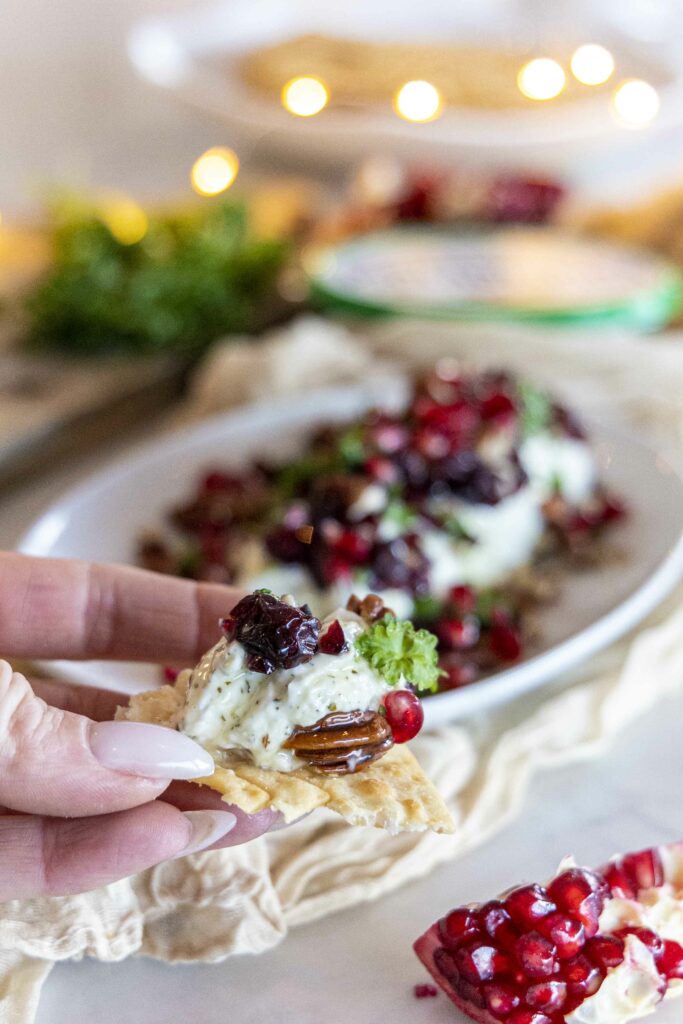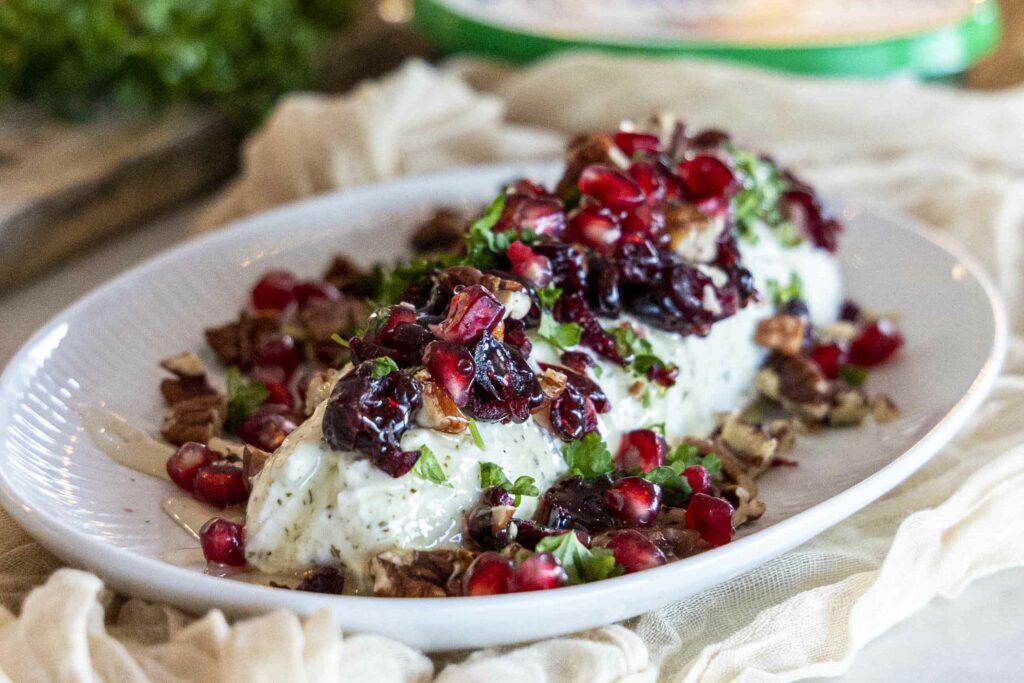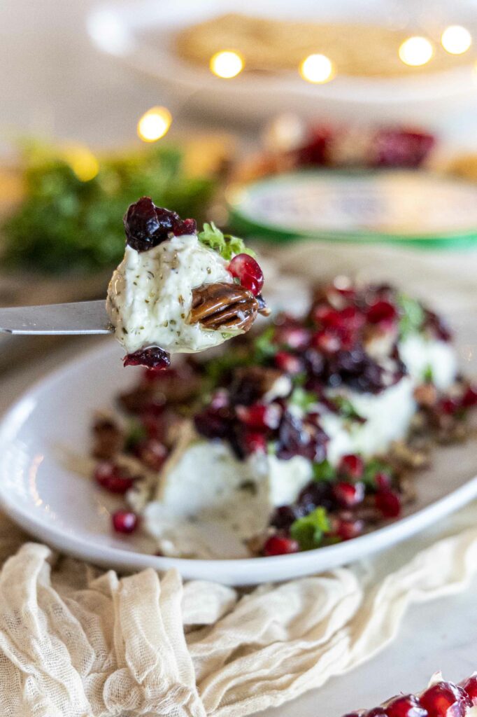 - Saxið trönuber, pekanhnetur og steinselju, setjið ofan á rjómaostarúlluna ásamt granateplakjörnum.