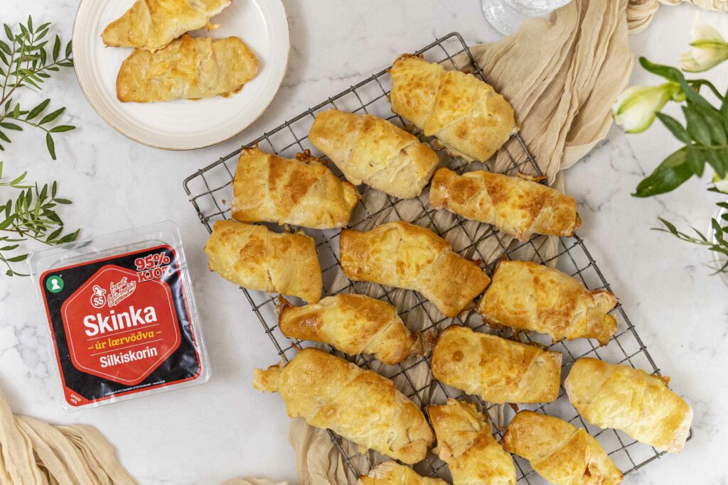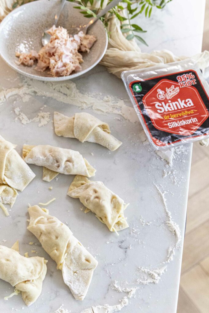 Þessi skinkuhorn eru einstaklega ljúffeng og góð. Deigið sjálft er það sama og er í kanilsnúðunum mínu frægu sem eru hvað þekktastir fyrir að vera einstaklega mjúkir og ljúffengir, bara svona svo þið vitið við hverju þið megið búast við af þessum skinkuhornum.