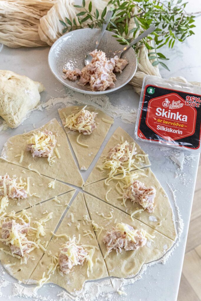 Fyllingin sjálf er svakalega góð! Skinkan hágæða lærkjöt sem iniheldur 95% kjöt sem þýðir að öll aukaefni eru í algjöru lágmarki og því sérlega hollur og góður kostur þegar kemur að bæði heilsu og bragðsjónarmiðum. Paprikusmurosturinn gefur ótrúlega gott bragð og skemmtileg tilbreyting frá skinkusmurostinum sem getur stundum verið smá of mikið að mínu mati. Mér finnst skemmtilegra að leyfa hágæða skinkubragðinu úr góðu skinkunni að njóta sín. Hornin eru svo pensluð með eggi fyrir bakstur og dreift smá af rifnum osti yfir þau til að gera þau ennþá betri.