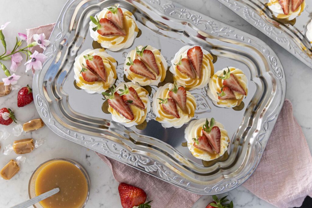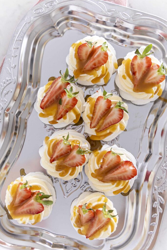 Mini pavlovur eru alltaf klassík. Léttar, stökkar að utan og mjúkar og „marshmallow“ kenndar að innan. Hér tek ég þær á næsta level með ferskum jarðaberjum og ómótstæðilegri karamellusósu.