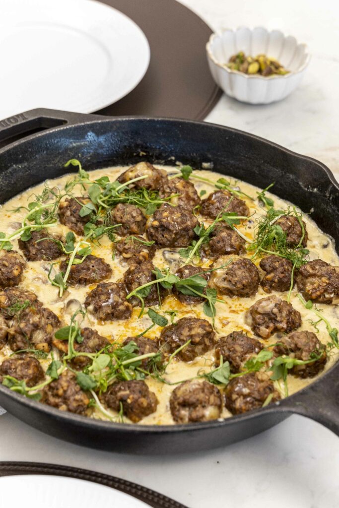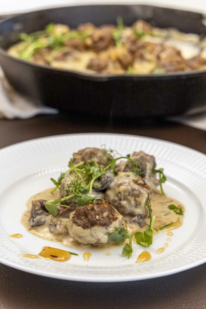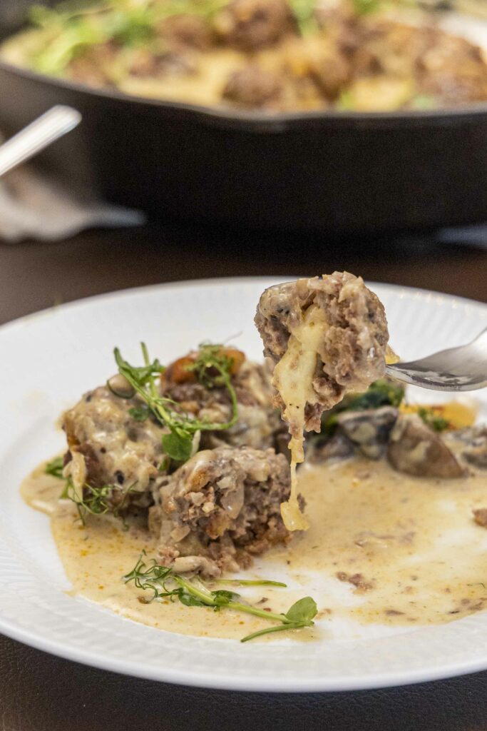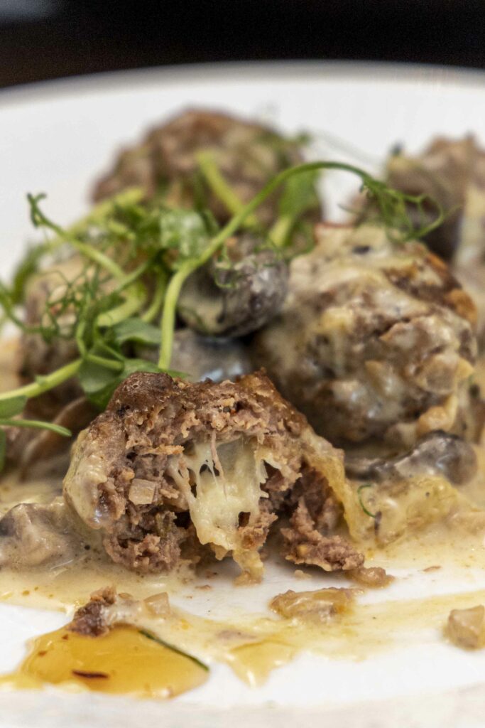 Mozzarella fylltar kjötbollur í sveppasósu.