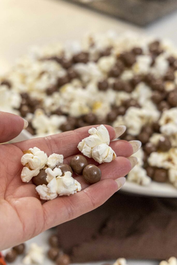 Svo kemur mitt uppáhald. Það er sturlað gott að setja Nóa Kropp yfir heitt poppið, súkkulaðið bráðnar aðeins og gerir poppið algjörlega ómótstæðilegt. Ég mæli svo mikið með að prófa þetta, hvort sem þið eruð að poppa heima eða fara í bíó. Ég geri þetta nánast alltaf og hef gert í mörg ár, svo það var vel viðeigandi að sýna ykkur þessa dásamlegu samsetningu 🍫🍿