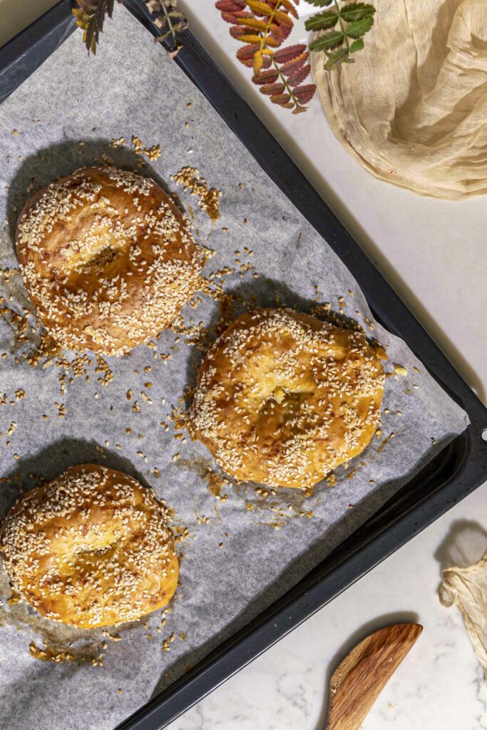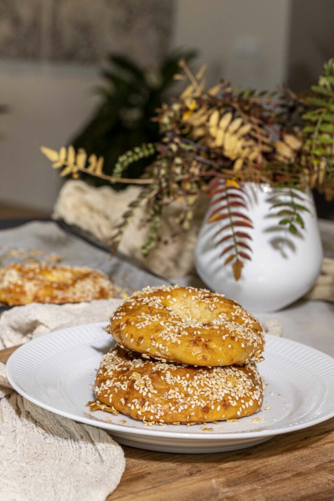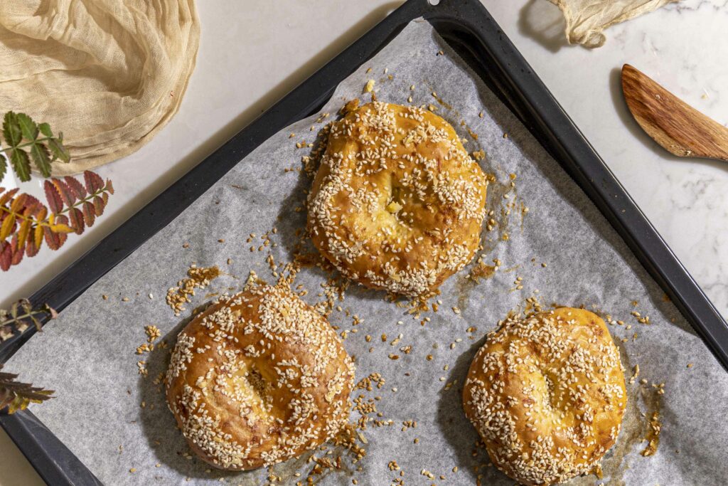 - Hrærið saman egg í skál og penslið á beyglurnar, dreifið sesamfræjum yfir.