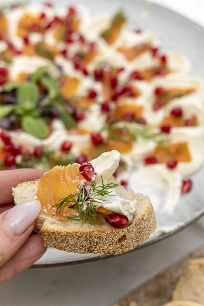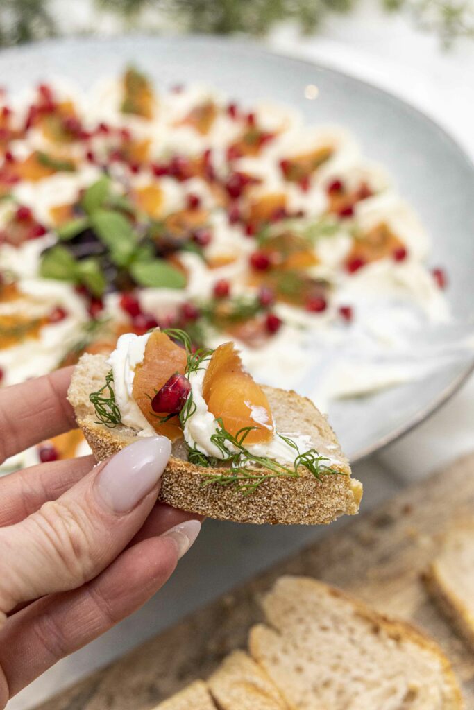 Það eina sem þú þarft að gera er að búa til litlar rjómaostaskálar með skeið og raða laxbitunum ofan í. Rífa svo dill yfir, dreifa granateplum og bera fram með ljúffengu baguette.
