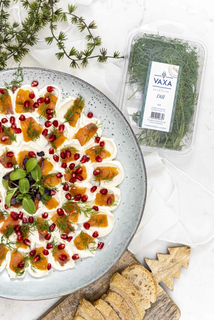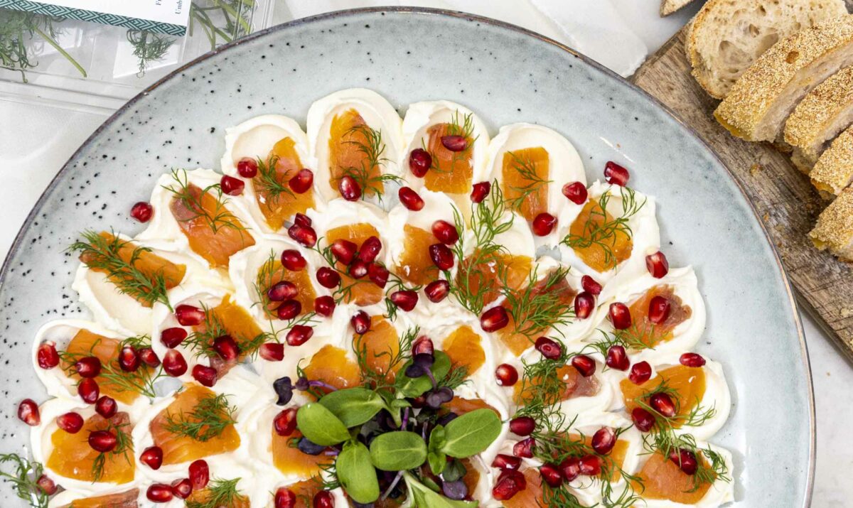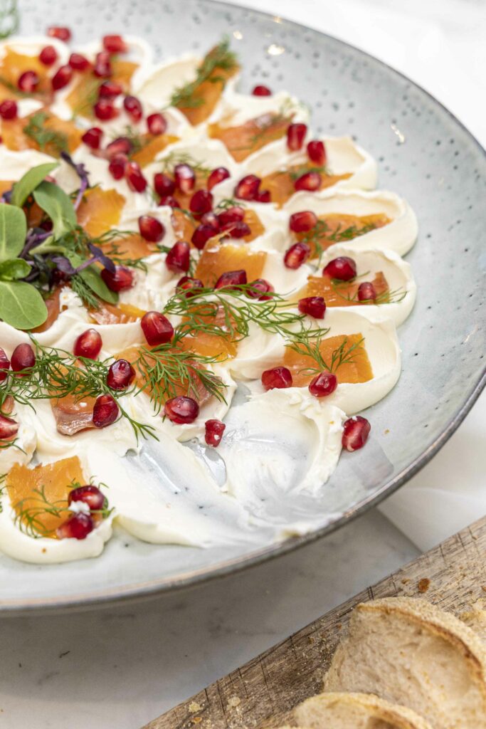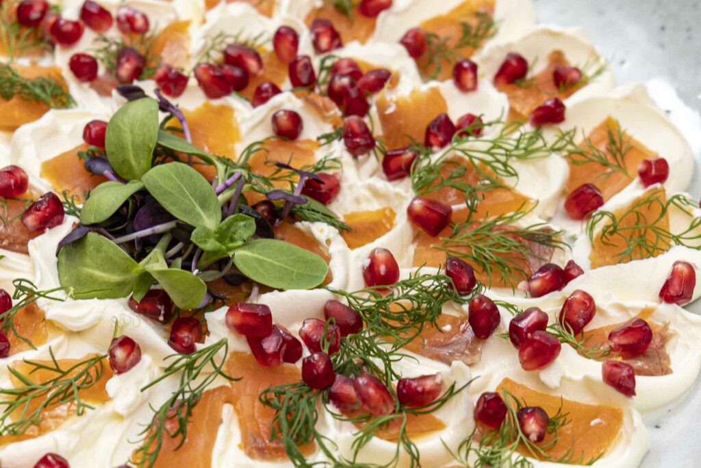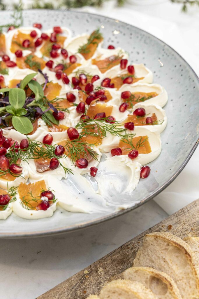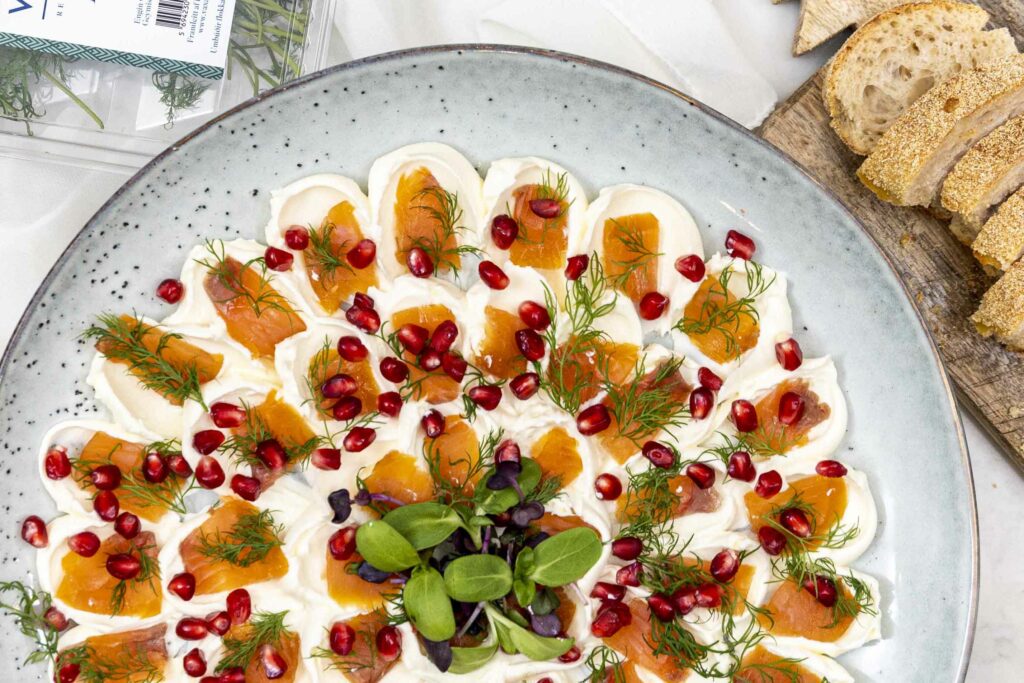 Einfaldara verður þetta ekki. Reyktur lax, rjómaostur, dill og smá granatepli fyrir ferskleika. Þetta er rétturinn sem allir elska og hverfur alltaf fyrst af borðinu.