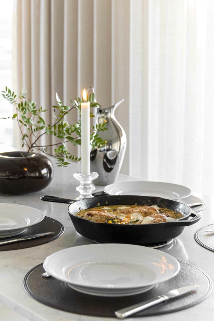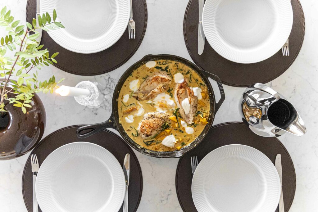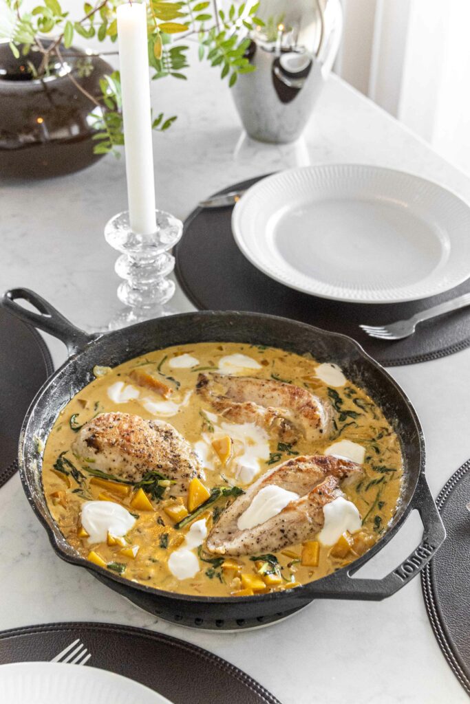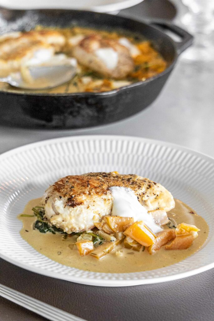Safaríkar kjúklingarbringur með sýrðum rjóma eldaðar í eini pönnu í bragðmikilli léttri rjómasósu með meðlætinu