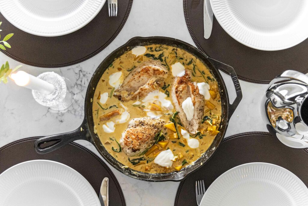 Safaríkar kjúklingarbringur með sýrðum rjóma eldaðar í eini pönnu í bragðmikilli léttri rjómasósu með meðlætinu.