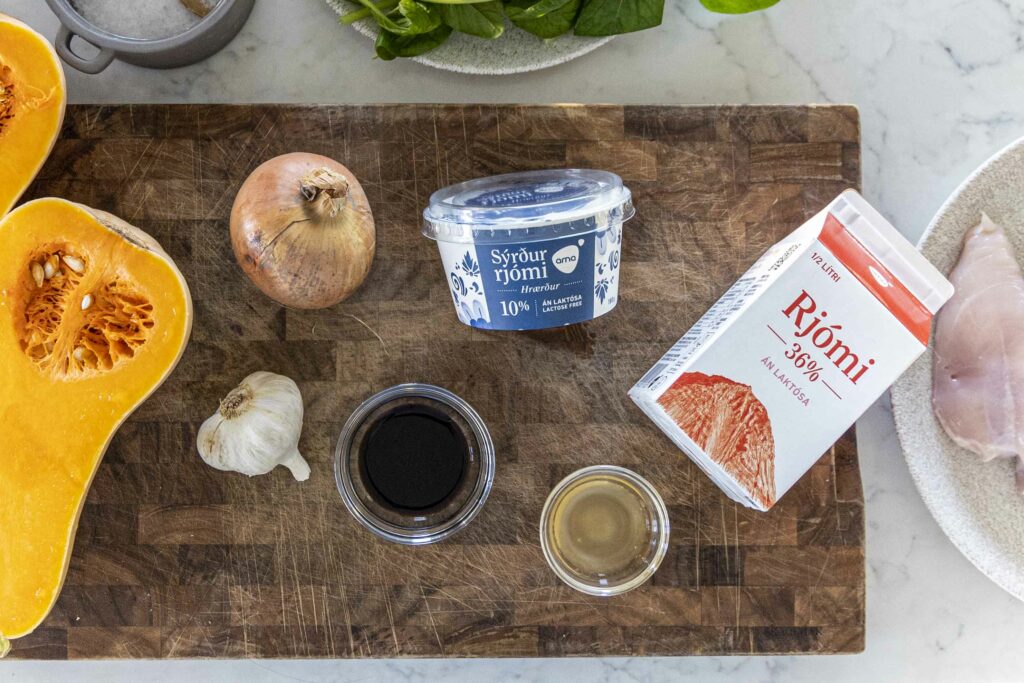 - Salt og pipar (bæði á kjúklinginn og í sósuna)
