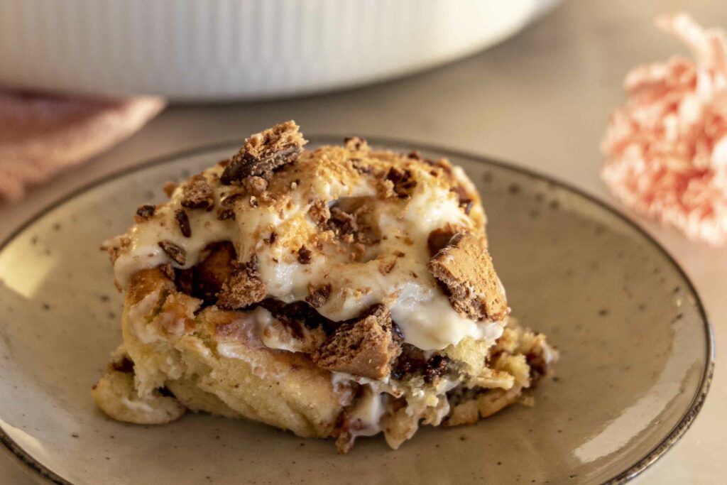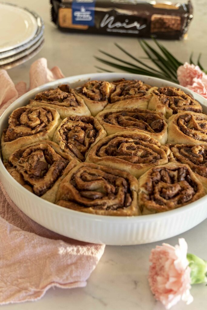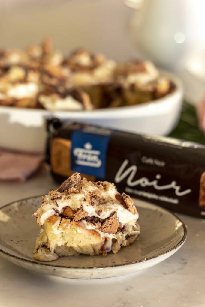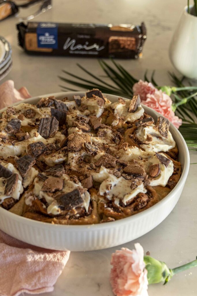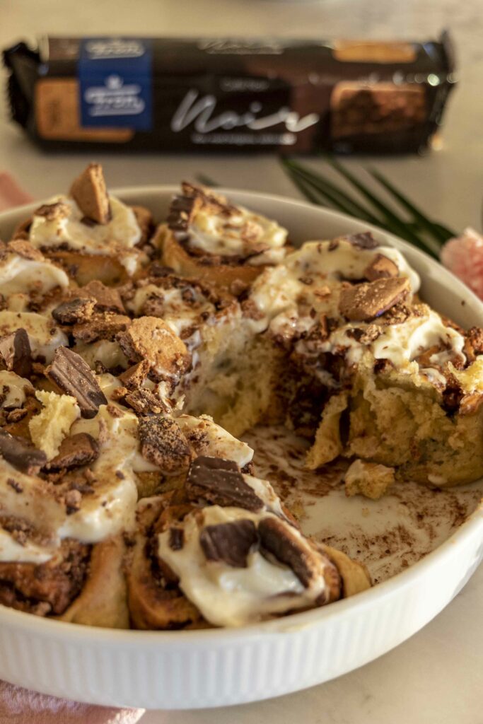 Þessir súkkulaðisnúðar eru dúnmjúkir og fylltir með súkkulaðifyllingu, en það sem gerir þá alveg sérstaka er krönsí kextoppurinn. Mulið Noir kex frá Frón gefur bæði fyllingunni og toppnum ómótstæðilega stökka áferð og djúpt súkkulaðibragð sem passar fullkomlega með mjúku snúðunum.