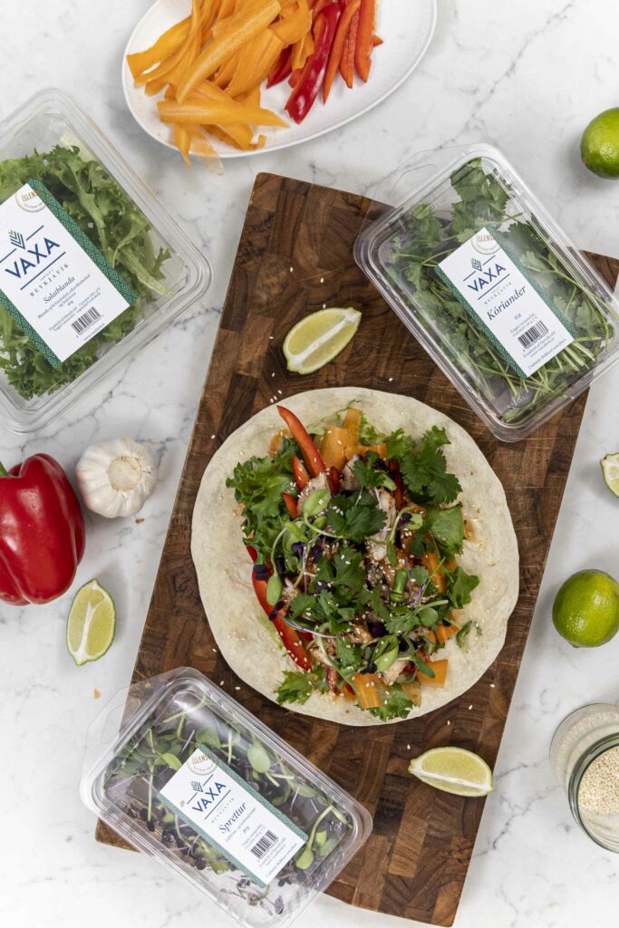 Þetta er svona réttur sem hentar jafnt á annasömum virkum degi eða þegar maður vill eitthvað létt en samt „wow“. Hentar vel til að undirbúa heima og taka með í nesti. Með fersku salati, sprettum og kryddjurtum frá Vaxa fær rétturinn bæði ferskleika og fallega áferð sem lyftir honum upp.