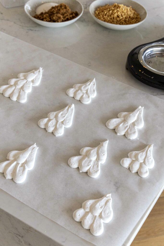 - Útbúið jólatré með því að þeyta saman eggjahvítum, cream of tartar, salti og sykri þar til stífir toppar myndast. Setjið í sprautupoka með stórum opnum sprautustút og sprautið tré, bæði 2 “hæða/greina” og 3 “hæða/greina” á smjörpappír og bakið í 30 mín við 170°C og blástur.